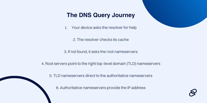 Your DNS query travels through several stages before reaching its destination. It starts with your device and ends at the website's server. Here are the steps of the journey: