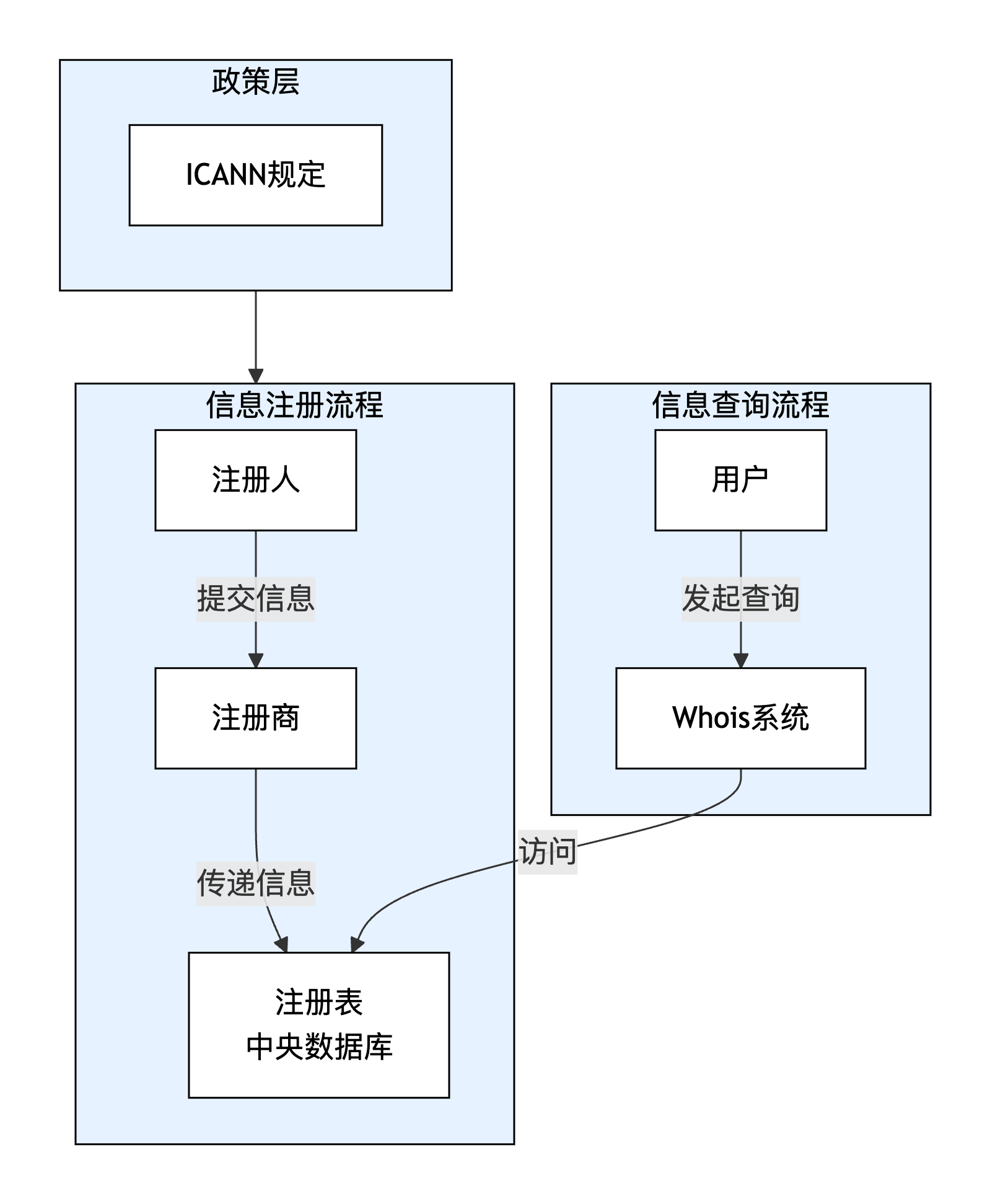 Whois查询的运作基于ICANN制定的互联网监管政策,该政策要求收集并存储域名注册人的联系信息,以建立个人与域名之间的关联。