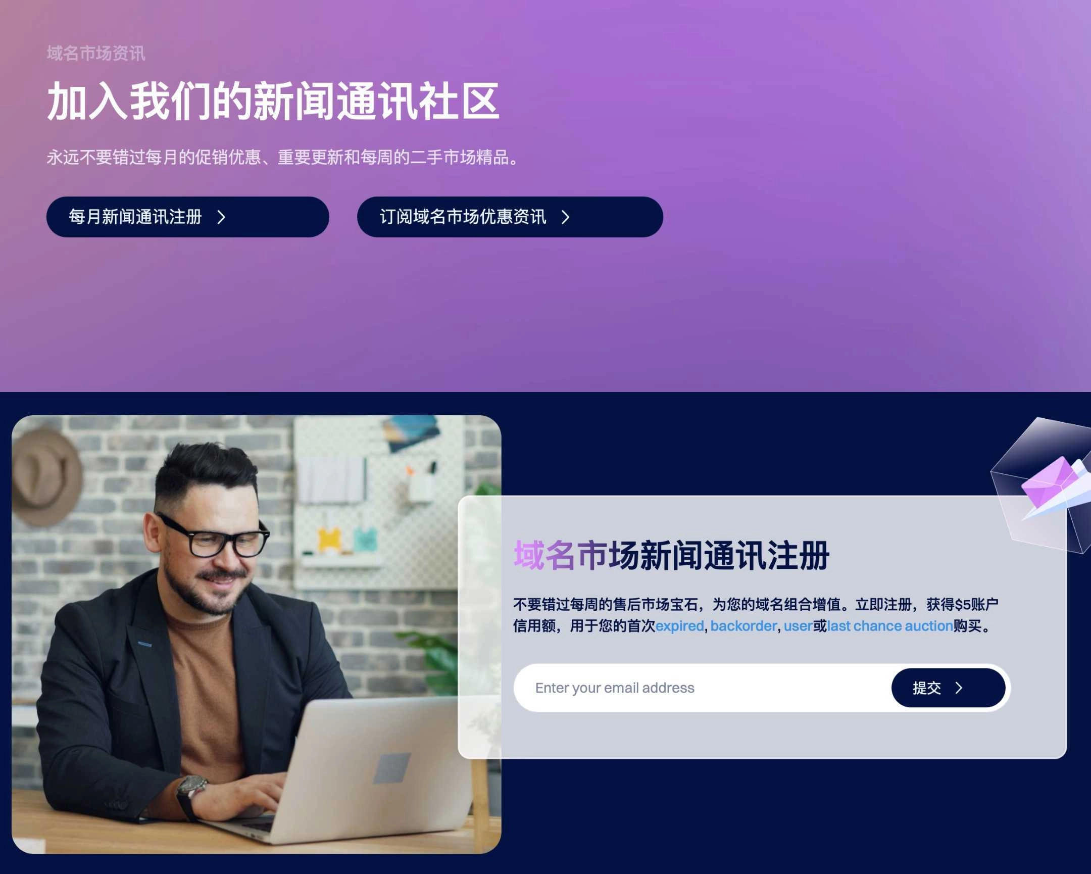 在“域名市场新闻通讯注册”处输入您的电子邮箱地址,即可享受折扣优惠,快来行动吧!如果您有任何问题,请随时联系我们的在线支持人员。