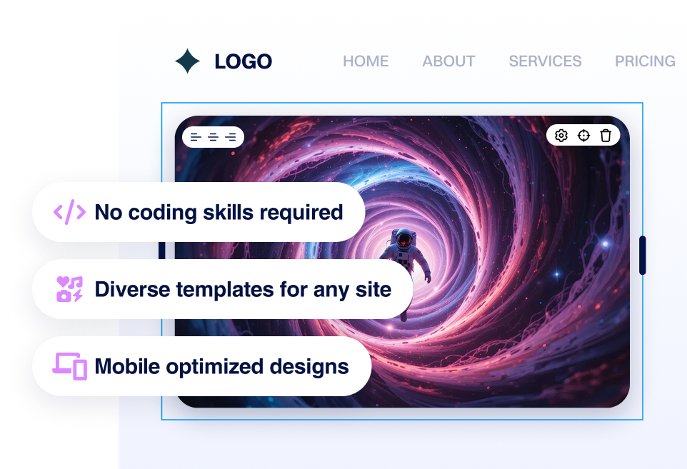 使用 AI 驱动的拖放工具和现成模板,构建现代化网站。免费发布在您自己的域名上,每个网站都支持移动端友好和 SEO 就绪。